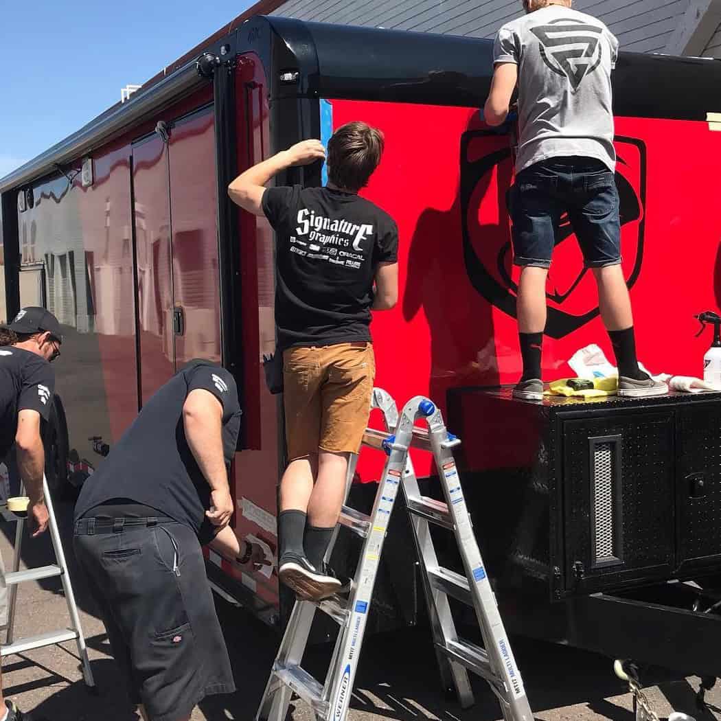 Next, we begin the color implementation and design process, beginning to bring your trailer wrap to life. Using top quality materials like those from 3M, Avery Dennison, and Oracale we ensure a clean, sophisticated, durable vinyl wrap. We are confident in our wrap abilities and know it will not only look great on your trailer it also will help to protect it against damage caused by road debris, weather elements, dings, and scratches. In fact, the benefits of a trailer vinyl wrap are endless!